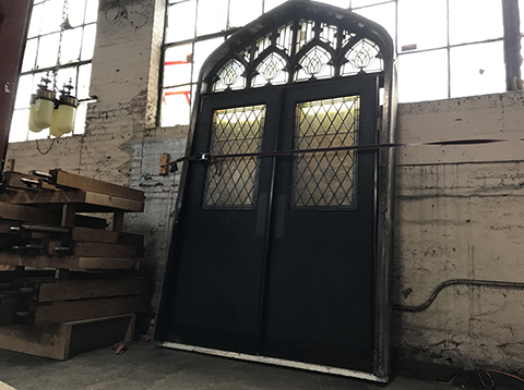 One of the largest elements of this project was the deconstruction of this huge room partition. Featuring a large arched header with intricate woodwork and leaded glass, our deconstruction crew was able to remove the structure in sections. Each arch-top window was removed, as well as the wood paneling and wooden roll-up doors. The header section had to be carefully cut and removed in 3 pieces.