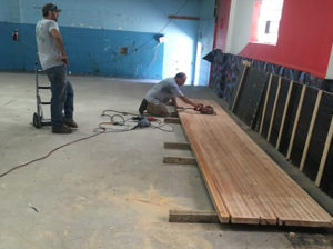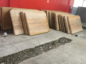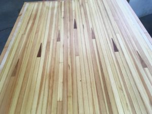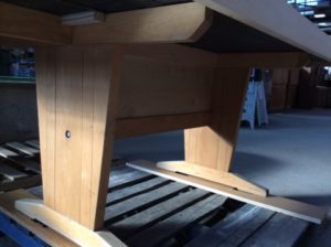 I want to draw your attention to some bowling alley dining tables we have in the store. These tables are made solely from materials our Deconstruction team salvaged. We have six unique tables available! Each is slightly different because they come from different sections of the bowling alley. One table is all maple (this is the hard wood surface that takes the brunt of the force from the bowling ball’s release). Three tables are maple and Douglass fir mix, and two are all Douglass fir! The bowling alley tops came from the former Swissvale Lanes (now Switch & Signal Skatepark, who allowed our deconstruction crew to come in and salvage this great material in order to prevent it from going to waste), and the solid maple table bases came from work tables rescued from a high school chemistry lab in Ford City before the building was demolished. Even the wood used to frame the tables came from various salvage projects.