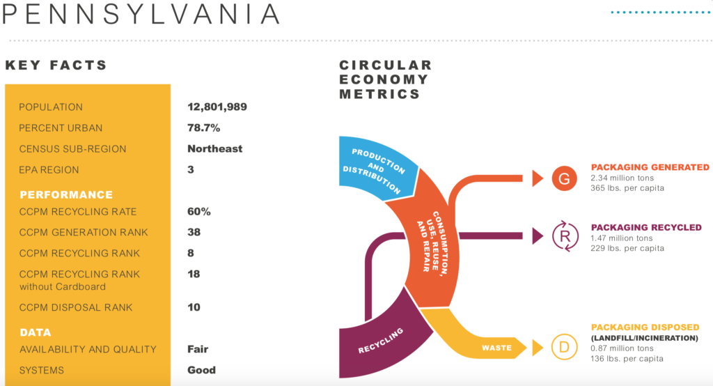 Two key takeaways from the study that drive high recycling rates: 8 of the top 10 states with the highest recycling rates have a deposit return system (known as “bottle bill”) and 7 of 10 have high disposal costs – PA’s disposal rates are relatively low and we don’t have a bottle bill.
