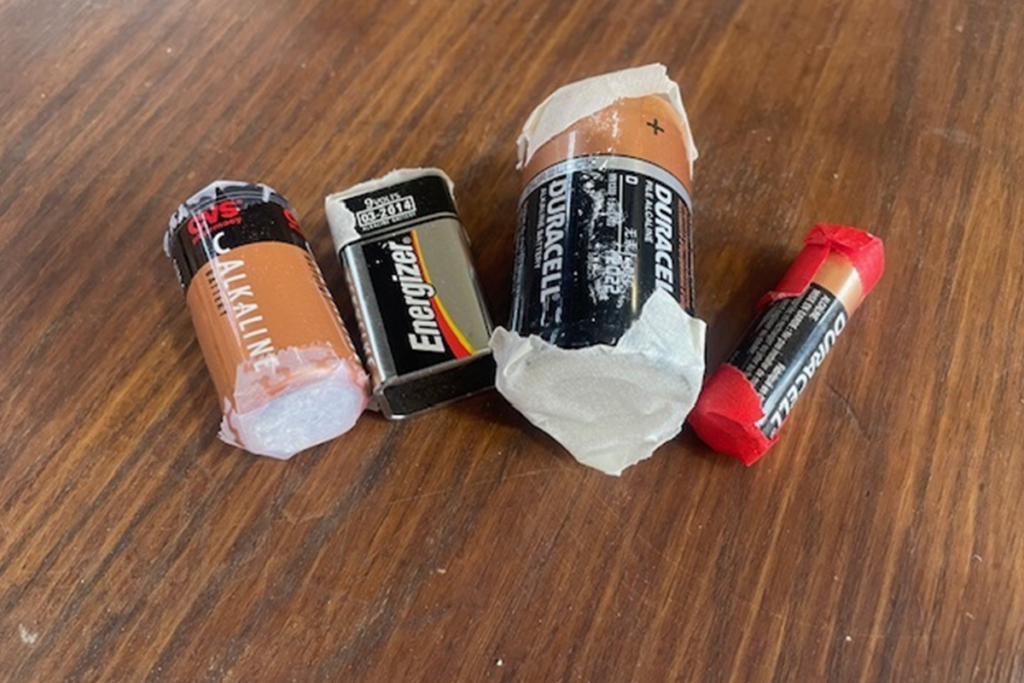 We only accept standard alkaline batteries. No rechargeable batteries, tools, or electronics accepted. Terminals of each battery must be taped over because even the residual energy of a spent battery can start a fire. Any kind of tape will do.