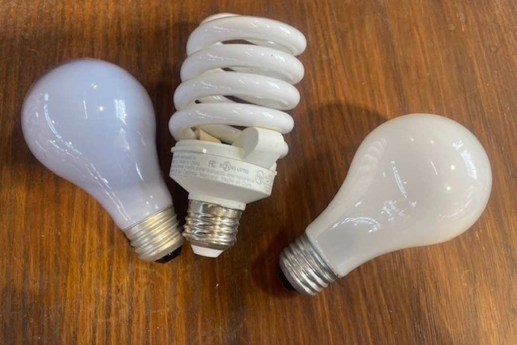 Fluorescent tubes 8 feet long or less, “U” or circle lamps, incandescent light bulbs (includes halogen bulbs), high Intensity Discharge bulbs, including high pressure sodium and mercury halide and mercury vapor CFL bulbs.