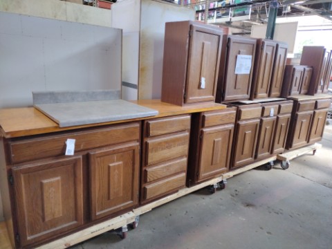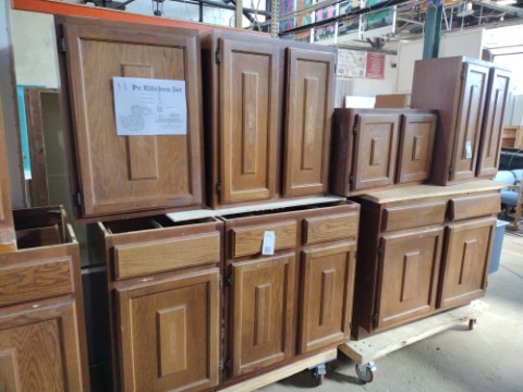 11 PC Oak Front Kitchen Cabinet Set in dark stain finish. Includes 5 wall cabinets & 6 base cabinets. No handles or pulls included. Durable, versatile, and a great value upgrade for your kitchen remodel or storage needs.