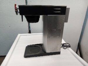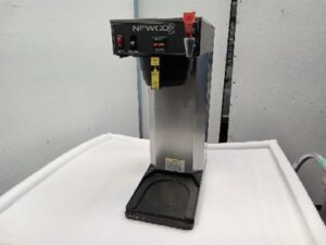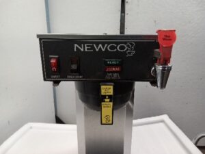 Newco drip brew commercial coffee machine with tap for hot water. Coffee brews into an insulated carafe. This coffee machine does not use a burner to keep coffee warm (Untested)