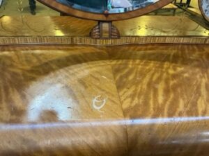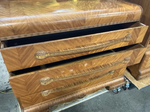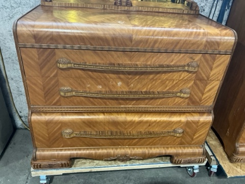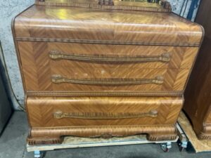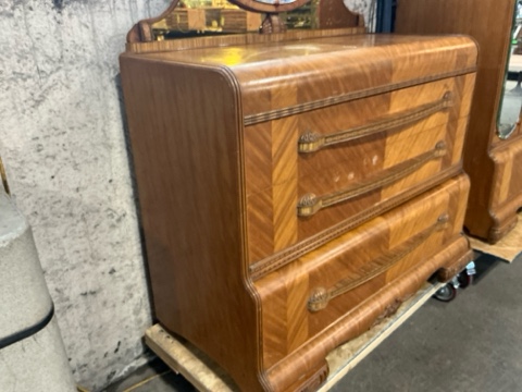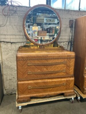 Art Deco style waterfall dresser with three drawers and matching round beveled mirror. Measures 25″ L x 46″ W x 63″ H. Vintage-inspired design with curved lines and classic detailing, offering stylish storage and timeless appeal.
