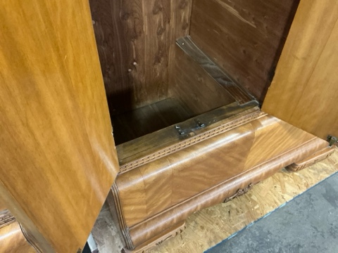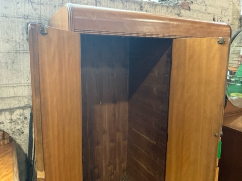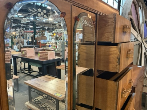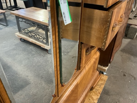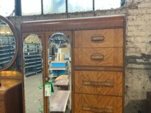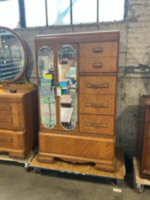 Art Deco style waterfall wardrobe featuring beveled mirror fronts and five drawers. Measures 22″ L x 40″ W x 65″ H. Classic vintage styling with bold lines, ample storage, and timeless appeal for bedroom or dressing area.