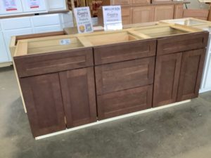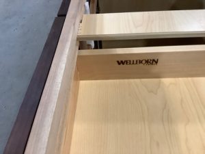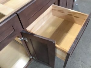 Wellborn double vanity base cabinet. Shaker style frameless cherry wood fronts with 5 piece drawer fronts, dark brown stain finish. MDF construction, soft close hardware. Surplus item, never previously installed.