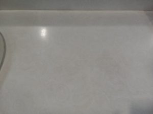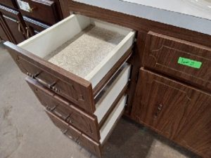Bathroom vanity set with counter and sink. Six drawers, two doors. Slight paisley pattern on countertop.