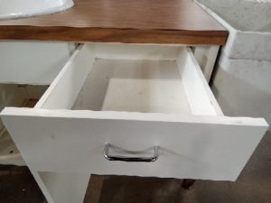 hroom vanity set with faux wood finish countertop and sink. Two drawers, two cabinets, and two doors under sink.