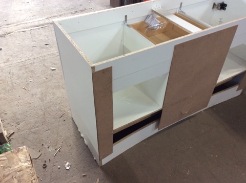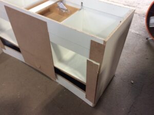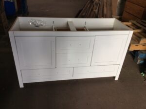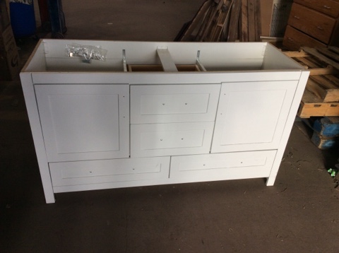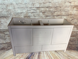 Bathroom Vanity by Woodcrafters Home Products: Double bowl width, white finish, 4 drawers, 2 doors. Spacious and stylish. Open box surplus—great value for modern bathroom upgrades.