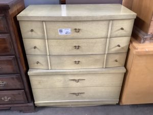 Mid-Century modern style tall chest of drawers. White birch style veneer with brass finish hardware, 5 drawers.