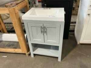Contemporary vanity set – blue-grey base with square-profile white sink. Sink shows some use but still functional. Great value buy.