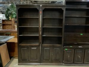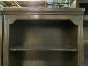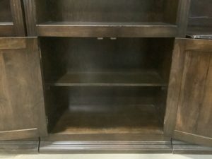 Four shelf dark wood bookcase with carvings along vertical, front edge. Two doors and small shelf at the base for additional storage! Sold individually