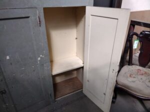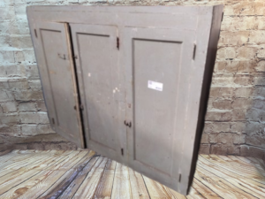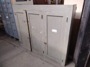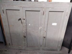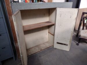 Three door green painted built in cabinet. Pegboard interior for easy storage and organization of tools, supplies, etc.