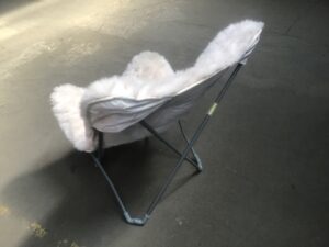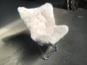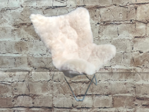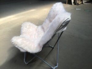 Vintage folding sheepskin butterfly chair in good condition. Features a cozy sheepskin cover, sleek metal frame for durability, and a foldable design for easy storage. Ideal for adding comfort and style to any space