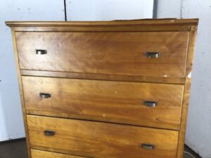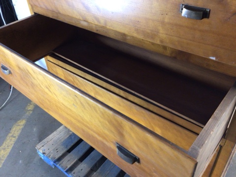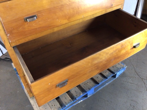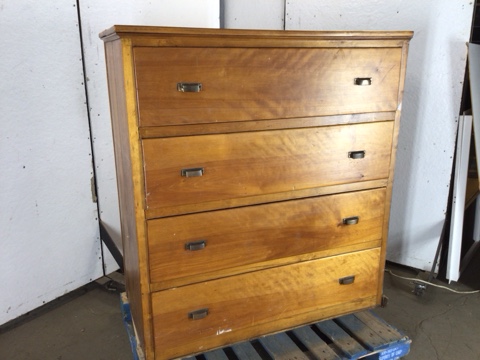 Solid maple built in cabinet – 4 large drawers with brass cup pulls – drawer interior: 43”x22”x10” – one drawer is missing half of the bottom panel – with a little work this would make an excellent built in or stand alone cabinet