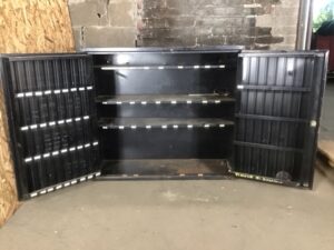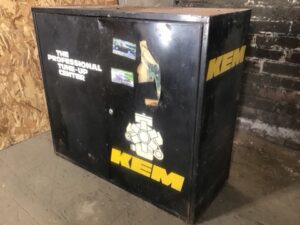 KEM Parts Cabinet – Steel construction, 11 adjustable shelves, lockable doors for secure storage. Ideal for commercial or workshop use. Durable and functional with typical signs of wear.