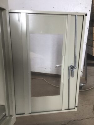 Salvaged commercial wall cabinet with glass doors, crafted from durable steel. Features an industrial aesthetic, offering both style and functionality. In good condition, perfect for storage or display in any space.