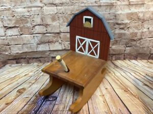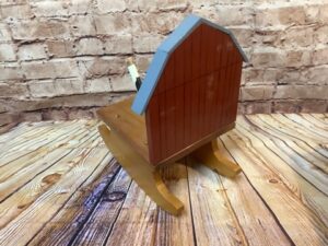 Gently used wood child’s rocking chair with a charming barnyard theme. Fair condition with signs of wear, adding to its rustic charm. Perfect for a nursery or playroom, bringing a touch of country style.