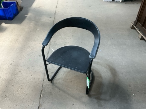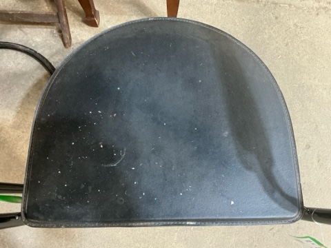Canasta Italian‑made leather armchair featuring a sculptural modern design and solid frame. Upholstered in black leather with noticeable white paint splatter. Comfortable and well‑built chair ideal for modern interiors, creative studios, or restoration