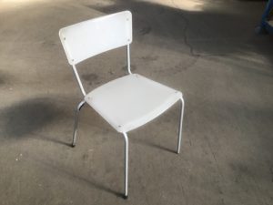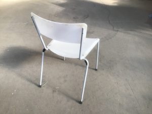 Keilhauer brand Gym model armless stacking chair. Translucent white plastic back and seat with mica satin grey powdercoated steel base.