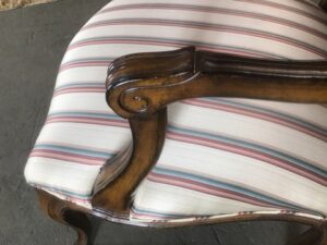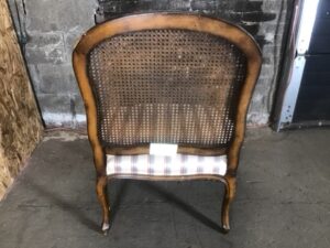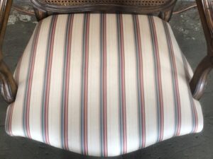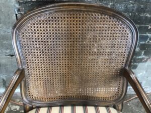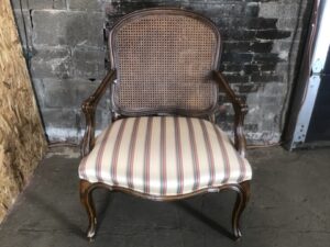 Elegant Louis XV style armchair in excellent condition. Features a caned back, striped upholstered seat (seat height: 16.5″). Perfect for adding timeless charm to your décor.