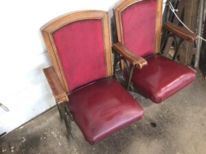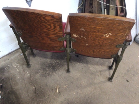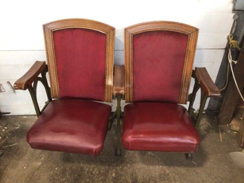 These fine theater chairs have served dutifully for many years, let them serve you! These would work great in a home theater or bar. Some wear in the upholstery but in good shape overall. Set of 2 bolted together.