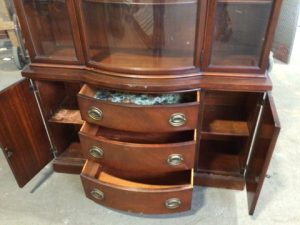 Vintage Drexel Furniture Federal style bowfront china cabinet. One piece, solid wood with mahogany veneer, curved glass door, 2 interior wooden shelves, 2 bottom side cabinets and 3 drawers with Hepplewhite style oval brass drop bail pulls.