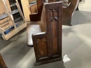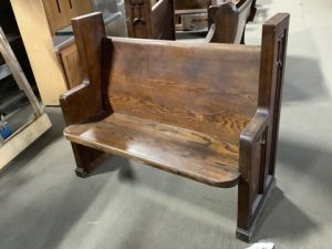 Church pews repurposed into loveseats at Construction Junction by local carpenters! Features a square topped end cap with gothic inspired carvings. Length varies between 47 1/4” to 48 1/8”.