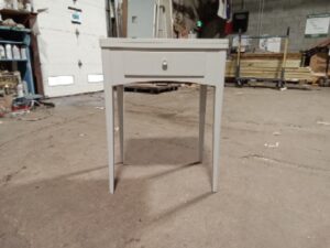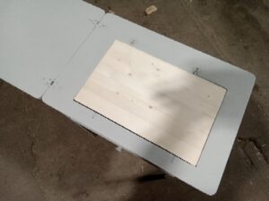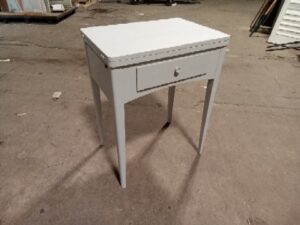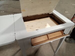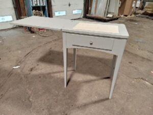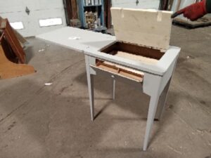 This desk was made out of a heavily damaged sewing machine table and has been fixed and turned into a small desk that can flip open for additional space and where the sewing machine would flip up, hides a shelf for additional storage.