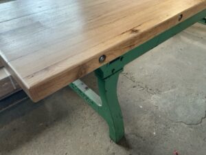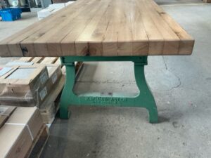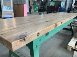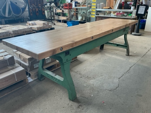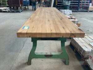 Industrial oak dining table handcrafted at Construction Junction. Massive 117”L x 31”W x 33”H design with a solid, heavy build. Perfect for lofts, studios, or modern industrial interiors seeking durability and statement‑making style