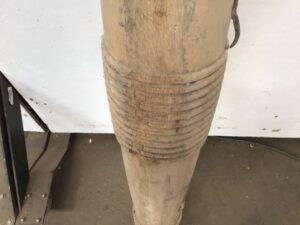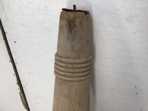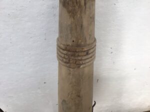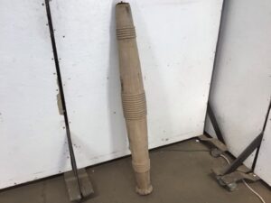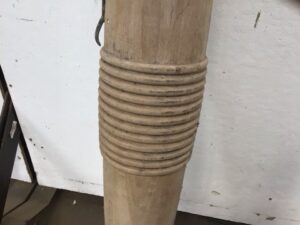 Antique porch column – center is 7 inches wide and either end tapers down to 3 1/4 inches – decorated with rings – wood is worn and has some dents and scratches –