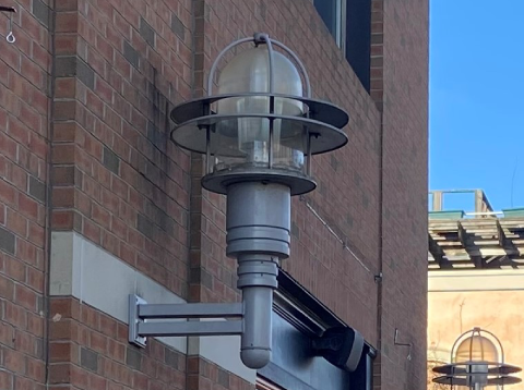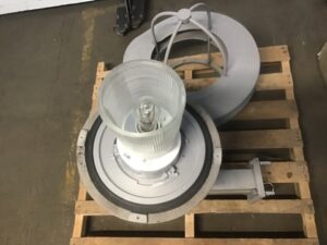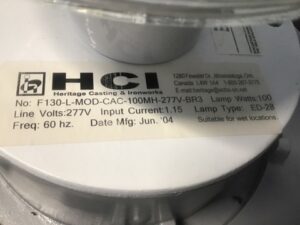 HCI Industries brand commercial exterior wall light. 277V single metal halide bulb, 100W. Aluminum housing, shade with cage and tenon arm in gray powdercoat finish, polycarbonate diffuser with internal glass surround. Salvaged by our deconstruction crew.