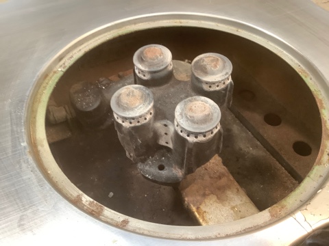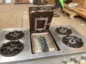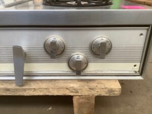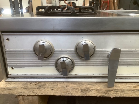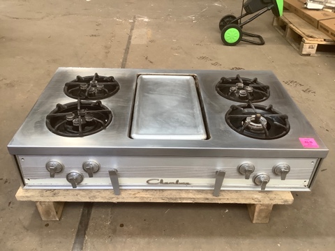 Vintage Chambers 1960s four-burner gas cooktop featuring classic “daisy” burners and a center griddle/salamander broiler. Sold as-is, untested. Ideal for restoration projects, retro kitchens, or vintage appliance collectors.