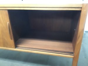 Vintage mid-century modern solid walnut credenza. Pair of sliding doors with matching wooden pulls, 2 interior shelves. Some markings and wear typical for age.
