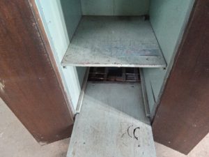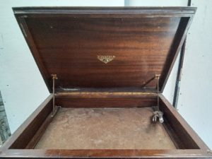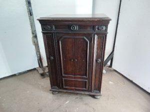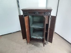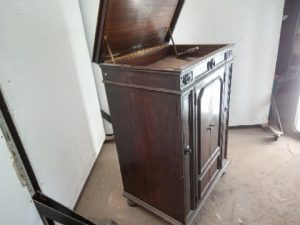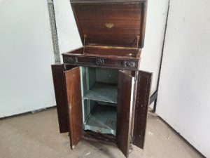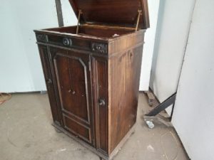 Vintage victor "credenza" Orthophonic phonograph cabinet – Cabinet only – finish is scratched and worn – inside has been hollowed out – pistons for upper lid no longer work