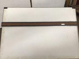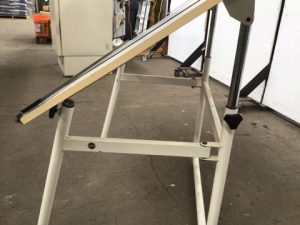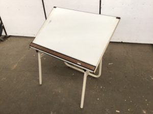 Portable drafting table. Tubular steel base with hinged legs and laminate top with straightedge, white finish. Adjustable angle via 4 telescoping posts. Full desk folds flat.
