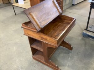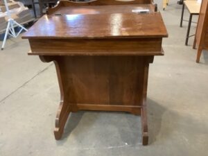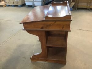 Vintage Pine lift top desk – possibly S.J. Bailey & Sons. Side shelving on both sides, underneath.