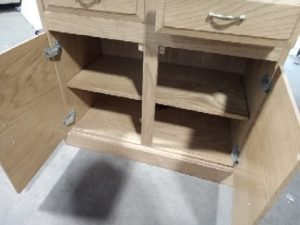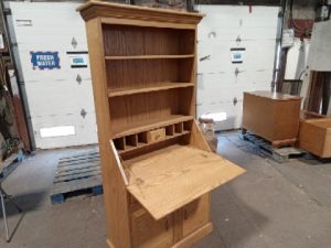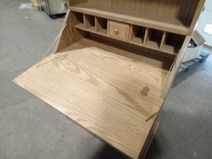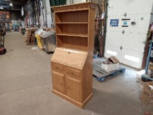 Two drawer, 2 door single shelf bottom, 3 upper shelves, with foldout writing surface and cubby storage