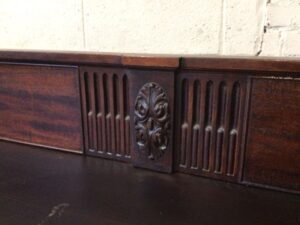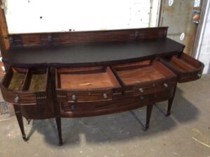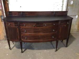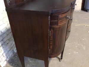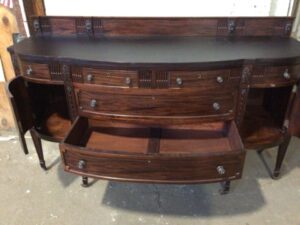 Antique dining room buffet – mahogany veneer – top has been painted – this buffet has a very dark finish but a bright elegance – finish on the doors and legs is in excellent shape – some key escutcheons are missing