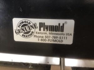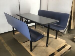Salvaged Plymold Contour restaurant booth with tabletop and two fixed benches. Blue with plywood and steel construction. Sturdy and stylish seating for diners, cafes, or home use. Measurements Are For Table
