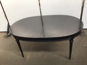 Vintage Drexel Furniture Classic Treasury Collection oval dining table. Sheraton influenced styling with fluted tapered legs. Missing leaf, solid wood with veneer, has been painted over black.