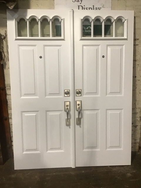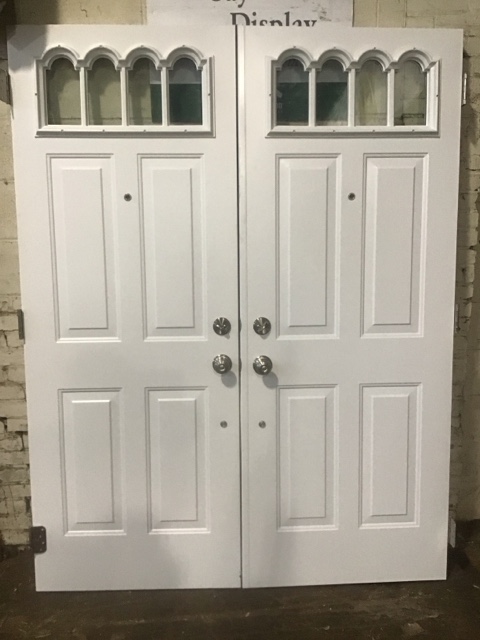 Exterior entryway steel French door set with decorative window inserts. Durable construction with classic paneled design. Ideal for front entry upgrades, renovation projects, or architectural salvage
