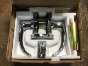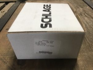 Schlage brand Sparta style heavy duty non-locking reversible passage door lever set. Fits 1 5/8 – 2in door thickness, 2.75in backset spacing. D10SSPA 625 Bright Chrome finish. MSRP $494.