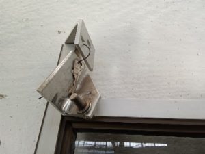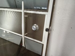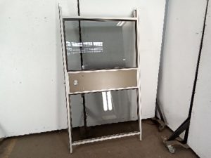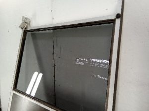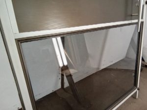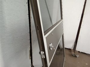 Commercial office door with 2 tinted glass panels – aluminum frame – Vertical handle – this door is not made to fully block an opening but should be mounted in the opening with space above and below – corners have some wear – lower hinge frame is worn
