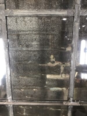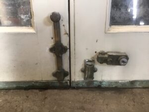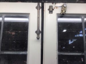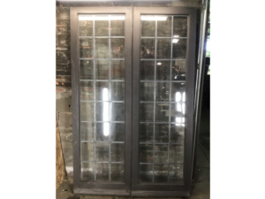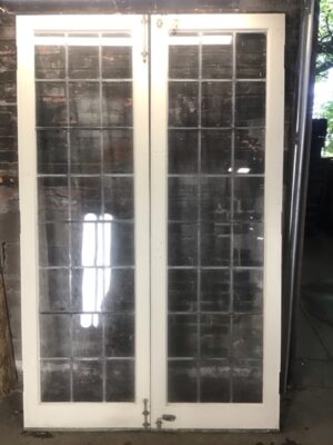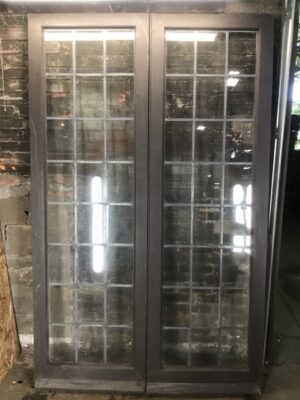 Interior French Door – 48 Lite leaded glass design with elegant brass slide bolts and surface-mounted latches. Key included. Measures 52″ wide x 82-3/4″ high. Beautiful architectural piece with classic charm.