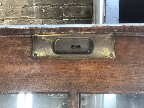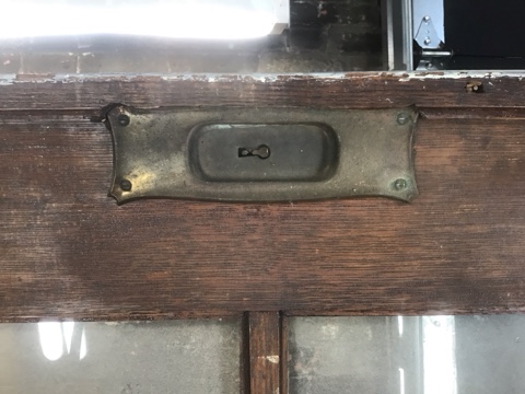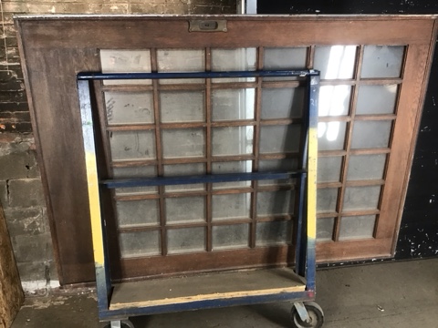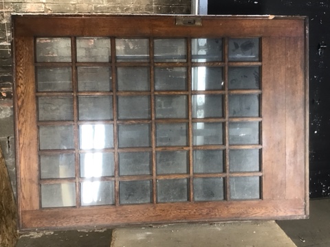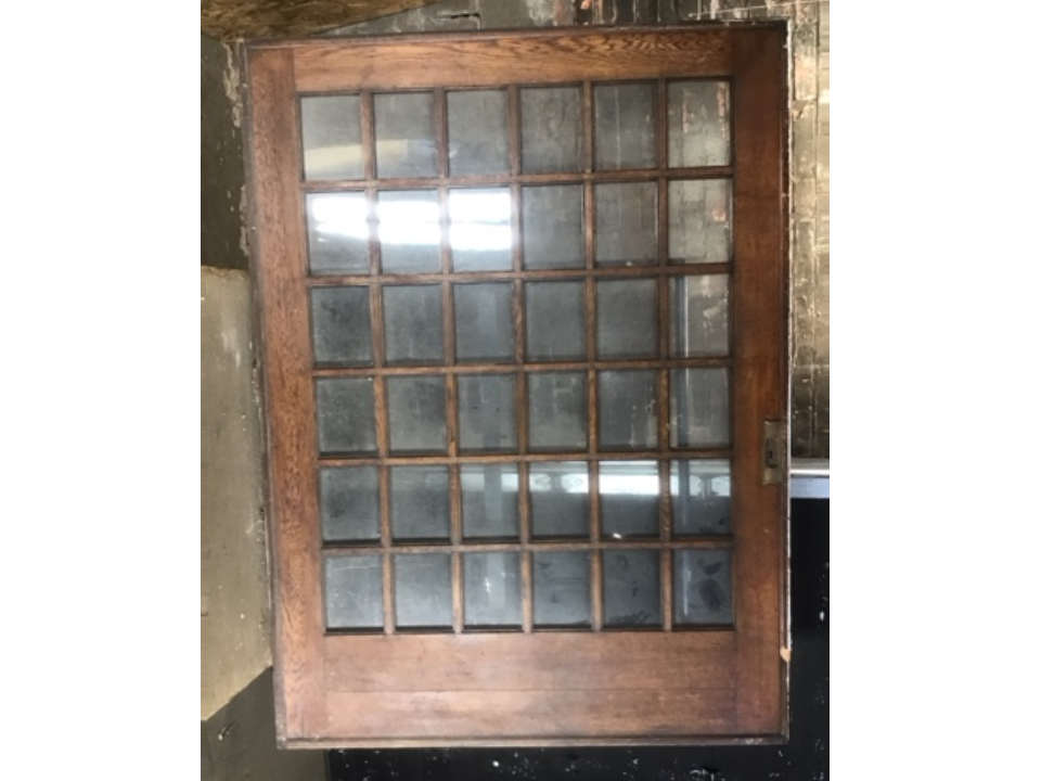 Vintage 36-lite oak interior pocket door, measuring 24″ x 60″. Features brass pulls and a warm oak finish. Classic design with glass panels, in good condition—perfect for restoration or adding vintage charm to your space.
