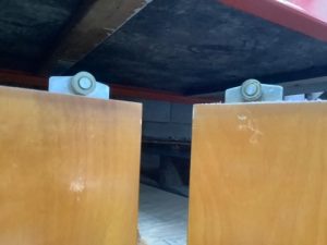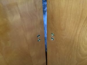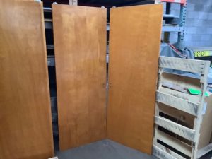 Reclaimed 1 3/8″ thick set of 2 interior hollow core flush sliding closet doors. Veneered with a medium golden color lacquered finish. Includes double round brass finish finger pull hardware and rollers, no track.