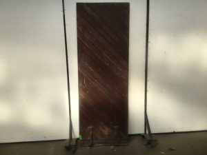 Reclaimed vintage solid wood exterior door. Diagonal tongue and groove beadboard paneling with wide exterior stiles and rails, knob and key hole cutouts. Fair amount of weathering, some splitting and cracks. Salvaged by our deconstruction crew.