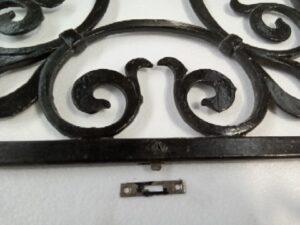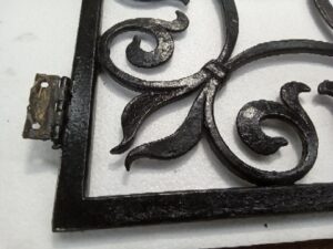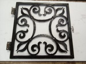 Reclaimed cast window/door guard. The intricate swirl pattern adds elegance and security, blending vintage aesthetics with modern functionality. Good condition, with age appropriate surface wear and imperfections.