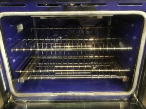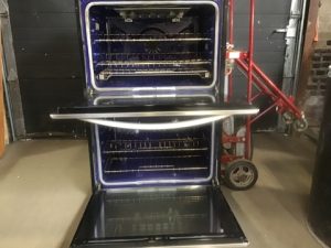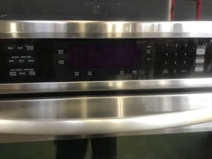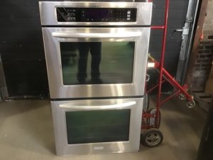KitchenAid Architect Series II Model KEBS207SSS04 double wall oven in stainless steel. Upper convection oven with EasyConvect time/temp conversion setting, digital control panel, adjustable broil, bread proof setting, self-cleaning, blue enamel interior.